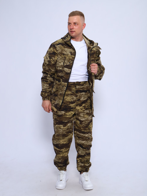 Мужские тактические брюки джоггеры имеют несколько карманов на липучке с клапанами и гульфик. Все швы тактической одежды прошиты армированными нитями, что делает военный костюм прочным и износостойким. Охотничий рыболовный костюм защитного зеленого цвета (маскхалат) позволит слиться с природой и совсем не маркий. На брюках расположены накладные карманы на липучке, а также шлёвки под ремень.