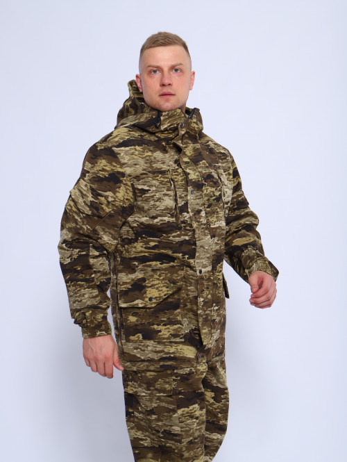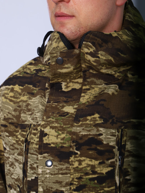 На куртке имеются большие карманы — врезные на молнии в области груди, а также накладные на рукавах и по низу куртки, что является очень удобным решением, учитывая специфику данного мужского демисезонного костюма Горка 3. В области локтя усиливающие накладки. Низ рукавов на резинке. Два боковых накладных кармана с клапаном.