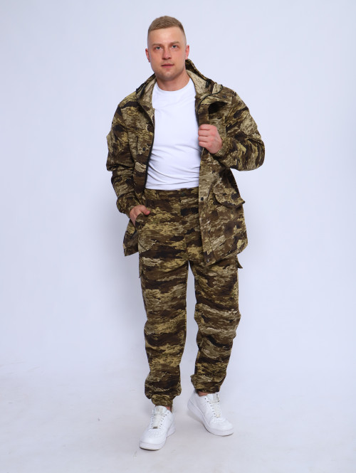 Костюм горка состоит из куртки свободного кроя на центральной застежке-молнии с планкой на кнопках и брюк свободного покроя. Мультикам комплект похож на армейский костюм камуфляжный и рассчитан как на летний сезон, так и на весну и осень.