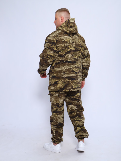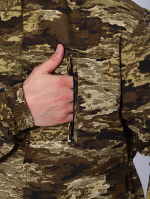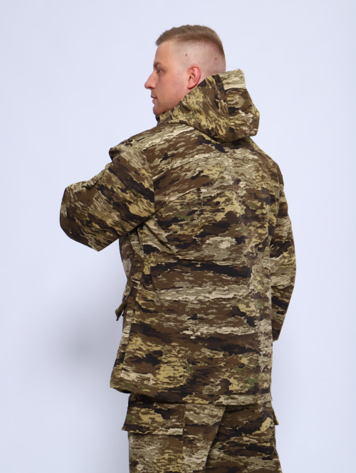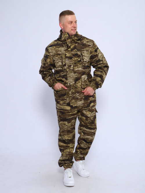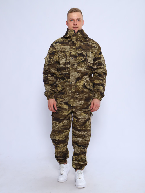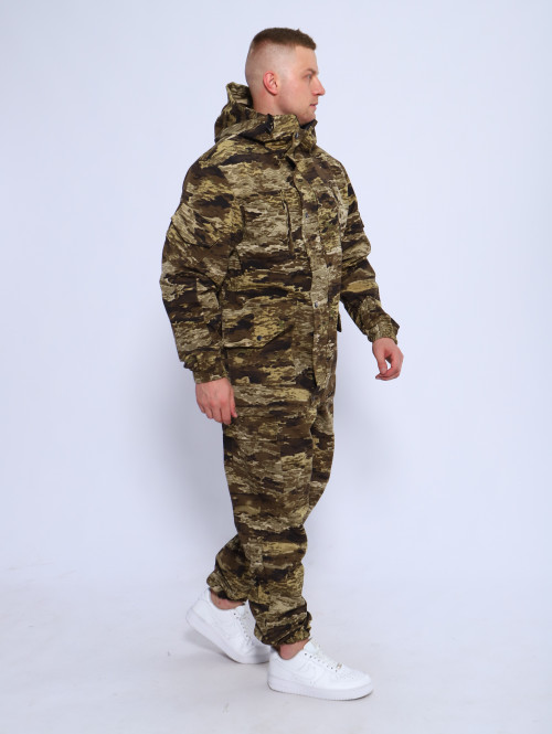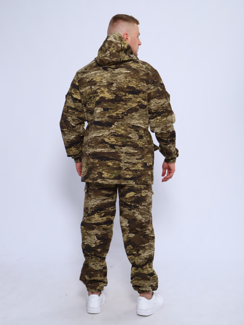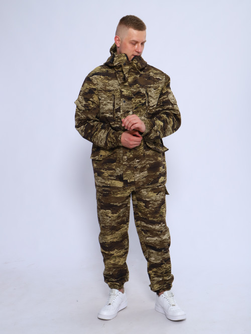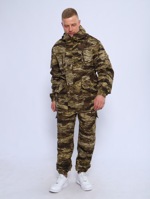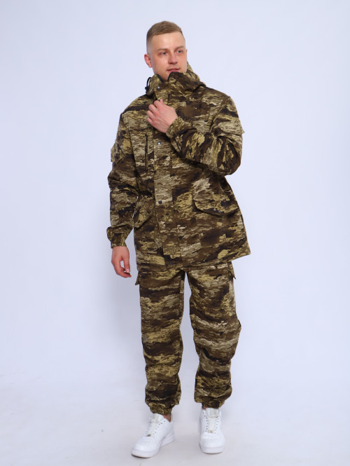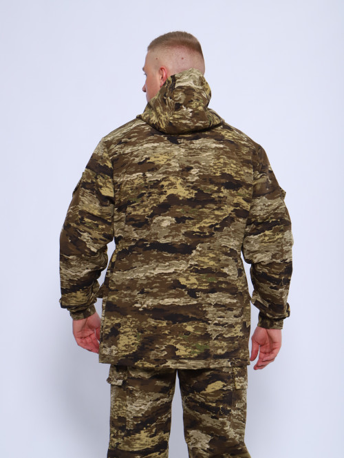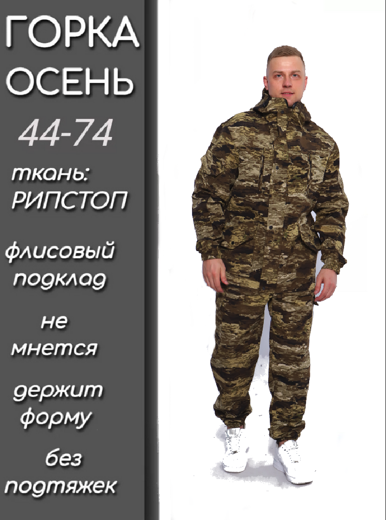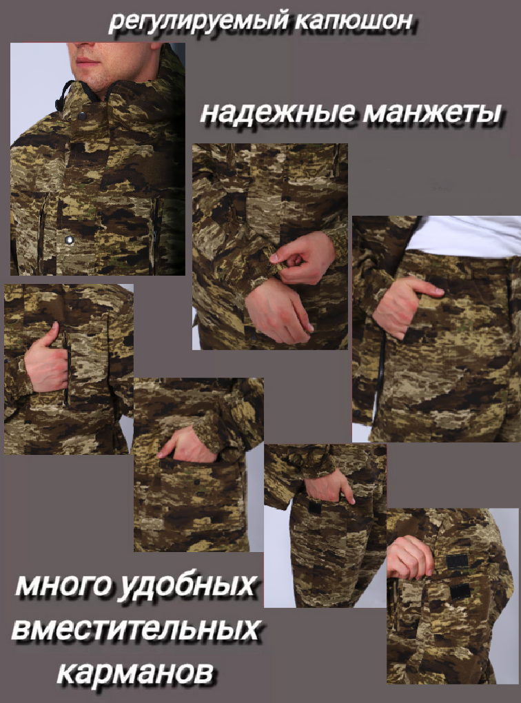 Камуфляжный утепленный костюм состоит из куртки свободного кроя на центральной застежке-молнии с планкой на кнопках и брюк свободного покроя. Мультикам комплект похож на армейский костюм камуфляжный и рассчитан на весну, осень и теплую зиму. Данный защитный костюм, выполненный из плотного, но при этом мягкого, и приятного на ощупь дышащего и непродуваемого материала рипстоп с подкладкой на флисе отлично подходит для летней и демисезонной рыбалки или охоты, что позволяет комфортно себя чувствовать, как в осенне-весенний период, так и летом. Куртка мужская длинная с закрытой застежкой на молнии и кнопках, а также с регулировкой по талии и на рукавах. Подойдет для мобилизованных, для мобилизации и военных. Задние половинки под коленом собраны резинкой, пояс на резинке, низ также на резинке. Важно: подтяжки с костюмом не идут. На куртке имеются большие карманы - врезные на молнии в области груди, а также накладные на рукавах и по низу куртки, что является очень удобным решением, учитывая специфику данного мужского демисезонного костюма Горка 3. В области локтя усиливающие накладки. Низ рукавов на резинке. Два боковых накладных кармана с клапаном. Мужские тактические брюки джоггеры имеют несколько карманов на липучке с клапанами и гульфик, все швы тактической одежды прошиты армированными нитями и делают костюм военный прочным и износостойким. Охотничий костюм рыболовный защитного зеленого цвета маскхалат позволит слиться с природой и совсем не маркий. На брюках расположены накладные карманы на липучке, а также шлёвки под ремень. Костюм это отличный подарок настоящему мужчине на 23 февраля день защитника отечества, день рождения. Уход: Военная одежда для мужчин ручная либо деликатная стирка при 30 градусах, без отжима. Сушка на плечиках.